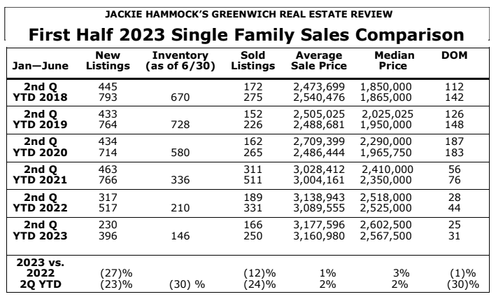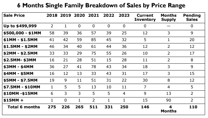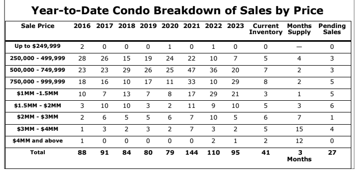 Analysis: Like single family homes, although there w as a decrease in the number of units Sold by mid-year when compared to 2021 and 2022, the 95 units sold year-to-date exceeds all the years since 2007. In 2009 unit sales were only 39. The decline in inventory, decline in new listings, and decline in days on mar- ket have created a shortage of supply of condos and co-ops priced up to $2MM. New larger luxury condos were built and sold since 2020 which has contributed to rise in reported average and median sale prices. Pending sales is low at 27 units because of the extremely low only 3 months supply available on the market now.